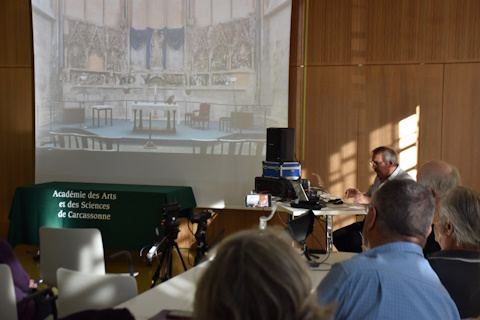 C'est devant une belle assistance fort interessée que s'est déroulée la conférence donnée avec brio par Chantal Ferriol, conservatrice déléguée des antiquités et objets d'Art de l'aude, sur le thème « Du petit Saint-Gimer à l'église Saint-Gimer, du retable aux objets dessinés par Eugène Violet-le-Duc »